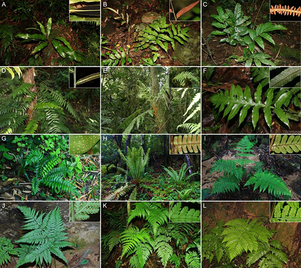 蕨类植物是现存维管植物中除被子植物以外多样性和丰富度最高的类群,其种数大约是裸子植物和石松类植物总数的5倍。虽然被子植物在全球生态系统中占据了主导地位,蕨类植物仍是陆地植物生态系统的重要组成部分。伴随着被子植物在白垩纪的崛起,其他陆地植物逐渐式微,蕨类植物却在被子植物为主的森林中演化出适应多样化环境的形态和物种多样性。在目前被广为接受的蕨类植物分类系统(PPG I,2016,J. Syst. Evol. 54: 563-603)中,收录了48科319属约10578种蕨类植物(monilophytes,ferns),其中核心类群水龙骨目(Polypodiales,polypods)包括250余属约8700种。 鳞毛蕨科(Dryopteridaceae)隶属水龙骨目,是蕨类植物中最大的科,包括2100余种,占所有现存蕨类植物种类的五分之一。该科近全球分布,温带和热带山区多样性最高,从沿海地区到高山树线均可发现鳞毛蕨科植物的身影。鳞毛蕨科大多数种为陆生,石生、附生、半附生,还有一些热带类群为根攀缘植物。该科植物具有复杂而丰富的形态多样性,基本涵盖了水龙骨目的多种形态性状。该科根状茎有横走、直立、斜生,或(偶)攀援;叶片一型(不区分孢子叶和营养叶,叶片既能进行光合作用又能产生孢子)或二型(孢子叶和营养叶形状不同),单叶到一至五回羽状分裂;叶脉羽状离散或网结成网眼,孢子囊多聚合为圆形孢子囊群,偶散生(于叶片背面);囊群盖有或无。 由于该科的世界性分布、不同属间物种数量的不均匀性,以及物种丰富而复杂的形态多样性,对其进行系统发育重建具有很大的挑战性。刘红梅等人(Liu et al. 2016. Plant Syst. Evol. 302: 319–332)在对鳞毛蕨科成员属较全面取样的基础上开展了该科的系统发育研究,确立了该科的3个主要支系和2个亚支系,并提出了鳞毛蕨科的3亚科(Dryopteridoideae、Elaphoglossoideae、Polybotryoideae)分类系统。然而,仍有几个问题悬而未决。首先,鳞毛蕨科3个亚科的系统发育关系尚未完全确定;其次,肋毛蕨属Ctenitis和Stigmatopteris的系统位置尚未解决,仅暂时分别置于Dryopteridoideae和Polybotryoideae中。此外,该研究未能对几个小属进行采样。PPG I(2016)分类系统接受了Liu et al.(2016)的分类处理,将该科划分为3亚科26属,其中2个位置未确定的属之后被分别证明为三叉蕨科和藤蕨科成员。