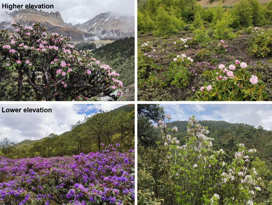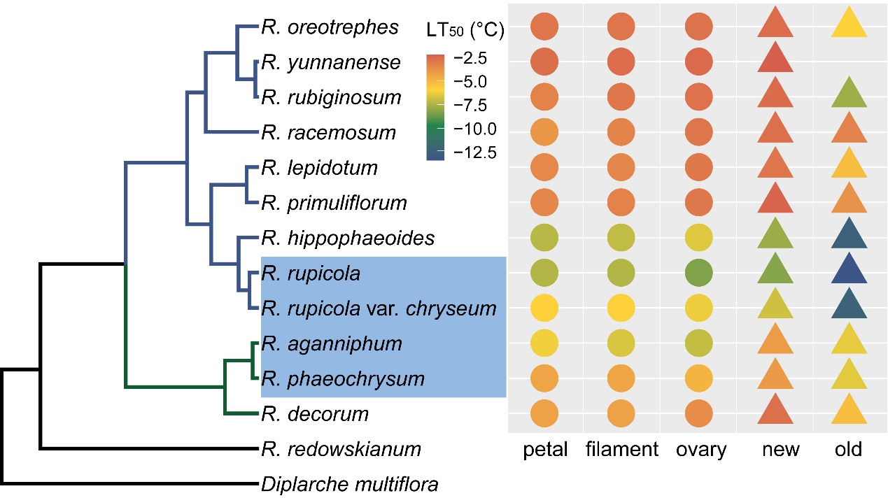 对于植物而言,关于“繁殖”与“生长”,“花朵”与“叶片”孰轻孰重的问题一直众说纷纭。近期,中国科学院昆明植物研究所孙航院士研究团队联合高山植物功能生态学知名学者、瑞士巴塞尔大学Christian Körner教授研究团队,对横断山区高(高山树线交错区)、低(中山森林带)海拔生境内(图1)的杜鹃花优势种类的花、叶抗冻性以及种间和种内开花、展叶物候时序进行了探索,以期从适应进化的角度为这一谜题提供些许线索。 研究发现高、低海拔生境内杜鹃种类的新生叶片在百年时间尺度上发生低温冻害的可能性为零[抵御冻害安全阈值(Safety margin)> 0];相反,高、低海拔生境内的早花杜鹃种类的繁殖器官(花朵)则面临明显的低温冻害威胁(有部分年份Safety margin < 0)(图2)。更加有趣的是,研究发现高海拔生境内相对“安全”的新生叶片并非完全得益于其更强的抗冻性,其中部分种类的抗冻性甚至与低海拔种类接近[如栎叶杜鹃(Rhododendron phaeochrysum)新叶抗冻性仅为-4.0°C],其主要依靠精准的展叶物候发生时间控制,将新生叶片置于低温发生频率和强度较低的夏至日前后,以“躲避”低温冻害威胁。然而,高、低海拔生境内的早花种类[如多色杜鹃(R. rupicola);腋花杜鹃(R. racemosum)]则不约而同地选择了“先花后叶”的物候策略,保证敏感新叶免受低温冻害之苦,却让花朵扮演了更多的“机会主义者”角色,在获得更多资源(例如传粉者)的同时,也承载了更多的冻害损伤甚至损失的风险。幸运的是,研究开展期间,研究者观察到低海拔早花种类腋花杜鹃(R. racemosum)和红棕杜鹃(R. rubiginosum)花朵受到生长季节早期低温冻害损伤,结合植物原生地实测低温与实验室检测获得物种花朵抗冻性数据的比较,也同时验证了抗冻性检测的准确性与可靠性。所以,对于山地多年生木本植物而言,在“繁殖”和“生长”之间的天平可能倒向后者,尤其是对于叶片寿命仅有2年的常绿杜鹃类群而言,1年甚至多年无子无嗣的结果尚可承受,而叶片一旦损失则可能面临生存的巨大挑战。 该研究联合植物原生地气候特点与历史低温极值和海拔梯度,首次探讨了横断山杜鹃花属植物繁殖和营养器官抗冻性与花、叶物候间的进化关系以及物种的适应策略,其中关于抗冻性具有系统发育保守性的观点(图4)也为今后该区域相关研究的开展奠定了基础。 研究结果以How phenology interacts with frost tolerance in Southeastern Himalayan Rhododendron species为题发表在树木生理学领域知名期刊Tree Physiology。中国科学院昆明植物研究所硕士研究生金泓燕为论文第一作者,瑞士巴塞尔大学Christian Körner教授、中国科学院昆明植物研究所杨扬研究员和孙航院士为共同通讯作者,已毕业研究生尹晓晴、起越和巴塞尔大学Jurriaan M. de Vos博士参与了研究工作。丽江高山植物园朱文浩、白马站扎西尼玛和昆明植物所吴志超、刘金梅在野外采样和室内实验中也提供了帮助。该研究得到了国家重点研发计划、国家自然科学基金联合基金重点项目等资助。