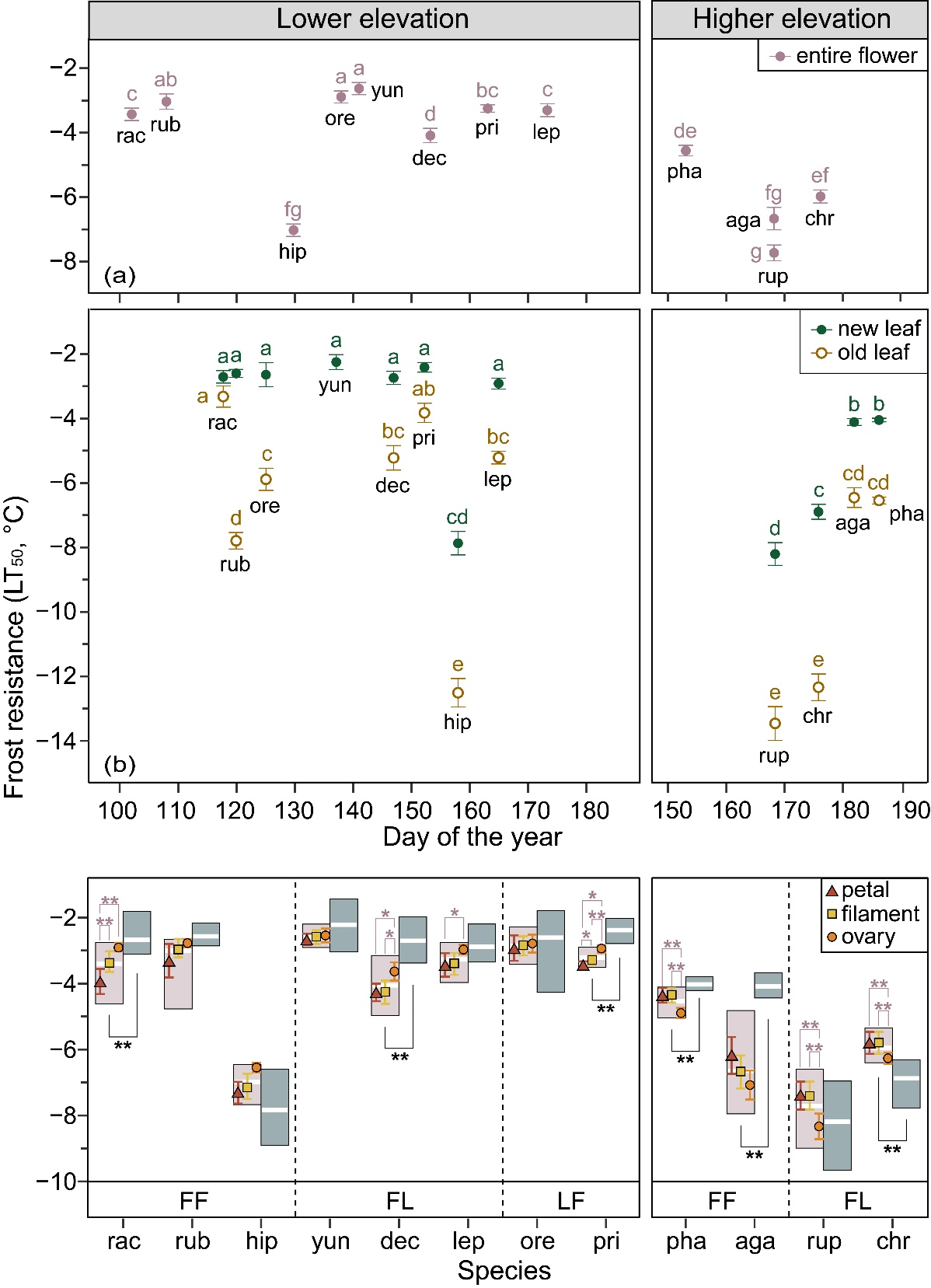图3 受试杜鹃花种类在(a)花朵、(b)新老叶的抗冻性比较,以及(c)花器官(花瓣、花丝、子房)与新叶抗冻性比较。注:(c) 中不同形状点表示6个个体花瓣、花丝、子房的平均抗冻性;白色短横线表示花整体和新叶的平均抗冻性;矩形表示6个个体不同器官抗冻性范围。花器官间的抗冻性比较结果显著用粉色星号表示,花整体与新叶抗冻性比较,结果显著用黑色星号显示。