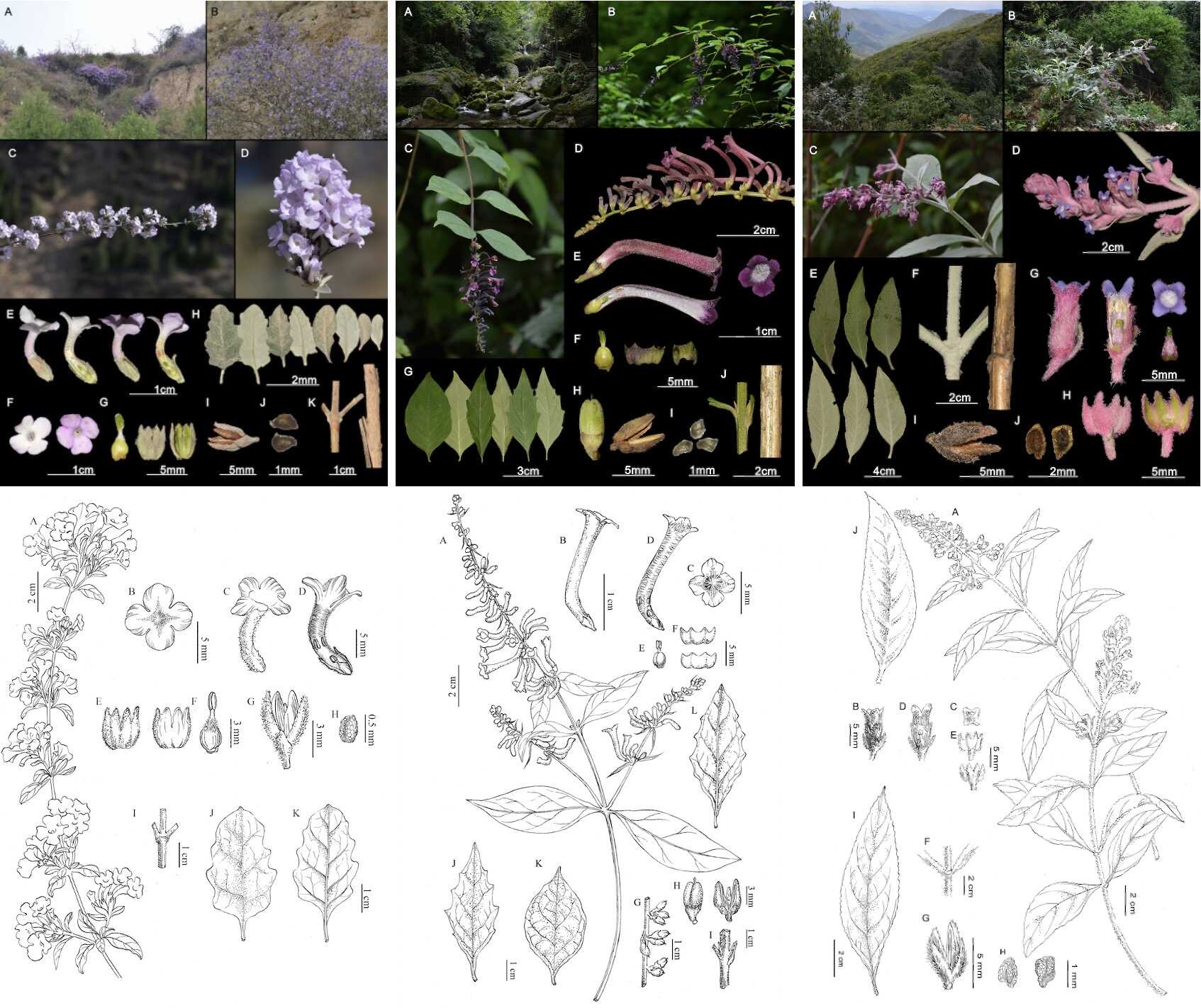 图2 三个目标物种的生境和形态特征图(杨丰懋、白增福)和墨线图(沙雯绘) 左:甘肃醉鱼草;中:绛紫醉鱼草;右:安宁醉鱼草