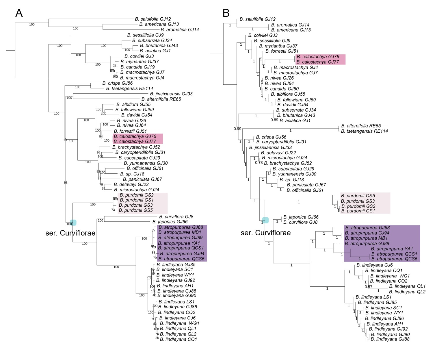 分类学是生物多样性保护和资源可持续利用的科学基础。然而,自然界复杂的物种形成过程,尤其是网状进化和多倍化等现象,会导致产生形态与遗传特征均难以区分的类群,即“分类学复杂类群”(Taxonomically Complex Groups,TCGs),为传统分类学研究带来巨大挑战。现代分类学研究采用整合分类学方法,综合形态学、分子系统发育、细胞核型分析及生物地理学等多维度证据,为精准界定物种提供了有效途径。亚洲醉鱼草属(Buddleja)植物兼具高观赏价值与重要的食药用功能,其进化历程中复杂的网状进化和多倍化事件,导致部分复合群和广布种的分类地位长期存疑,是典型的分类学复杂类群。 该研究通过大范围的野外调查取样,获取了详实的形态数据和大量的分子材料,在此基础上开展了形态学比较研究,通过核型分析确定各类群染色体数目及倍型,利用高通量测序技术获得了大量核基因序列和叶绿体全基因组数据进行系统发育分析和群体遗传学研究,并结合地理分布信息,对亚洲醉鱼草属多个争议类群进行了整合分类学研究(图1)。主要研究发现包括:(1)甘肃醉鱼草物种地位的恢复:甘肃醉鱼草(B. purdomii)曾被处理为短序醉鱼草(Buddleja brachystachya)的异名,但在系统发育关系上二者并未构成单系群;核型分析进一步揭示二者存在倍性差异(短序醉鱼草为四倍体,甘肃醉鱼草为二倍体),且二者地理分布相隔较远(短序醉鱼草为横断山特有种,甘肃醉鱼草分布于黄土高原),基于上述证据整合,支持恢复甘肃醉鱼草的独立物种地位(图2 左);(2)新种绛紫醉鱼草的发现与描述:分布于成都平原西部和云南东北部的醉鱼草种群,在形态特征和遗传结构上均与广布种醉鱼草(B. lindleyana)呈现显著分化。基于其独特的绛紫色花部特征,研究团队将其描述并命名为新种——绛紫醉鱼草(B. atropurpurea)(图2 中);(3)新种安宁醉鱼草的发现与描述:在云南省安宁市发现醉鱼草属新种,其圆锥花序密被粉色分枝毛,具有较高观赏价值。细胞学证据表明该种为六倍体,系统基因组学分析揭示其核基因与叶绿体基因组存在明显的谱系冲突(cytonuclear discordance),暗示该物种可能通过异源多倍化形成。据其模式产地命名为安宁醉鱼草,拉丁学名B. calostachya(calo-:美丽;stachys:花序)表征其独特花序形态(图2 右)。该研究最终将亚洲醉鱼草属物种总数修订为30种(图3),为该类群的濒危物种保护和可持续利用奠定了分类学基础。 上述研究成果以Unraveling the taxonomy of Asian Buddleja: Species discovery and delimitation through morphological comparison,ploidy analysis and phylogenomic insights为题,发表于植物分类学经典期刊TAXON。中国科学院昆明植物研究所博士研究生杨丰懋为论文第一作者,葛佳副研究员和陈高研究员为通讯作者,刘恩德、郭永杰、沙雯、金敏飞、马雨倩和四川省自然科学研究院李小杰、安徽师范大学张思宇、西北师范大学白增福也参与了该研究。研究得到昆明植物园、昆明植物研究所标本馆、植物多维成像及多样性分析平台、中国西南野生生物种质资源库的支持,并得到国家自然科学基金、云南省基础研究面上项目和云南省兴滇英才青年人才专项的支持。