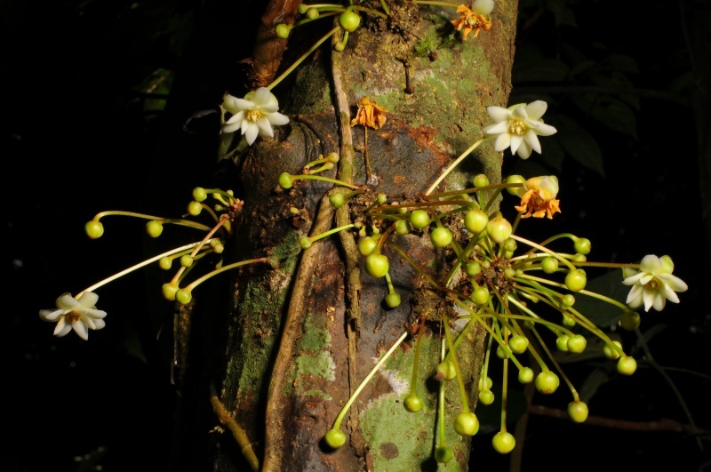 八角为著名的调味香料,为五味子科八角属植物。该属全世界约有50种,属于较为典型的东亚——北美间断分布,其中中国约有30种,成为该属现代分布中心的主体。此前,世界上具有典型老茎生花习性的八角属植物只有2种,均分布在热带东南亚,分别是分布在越南南部的Illicium viridiflorum和马来西亚加里曼丹的Illicium stapfii。目前报道的睡莲八角Illicium nymphaeiflorum为唯一分布在中国具有典型老茎生花的八角属植物(图1),同时也体现其产地的热带性质。