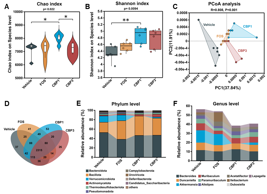 图2 臭参多糖调节小鼠肠道微生物的菌群丰度 民间食用臭参后常伴随明显的胃肠道反应(如矢气频频、改善便秘等),这提示臭参可能具有调节肠道菌群的作用。膳食纤维的功效与其结构异质性密切相关,但多糖链长对肠道菌群调节的具体影响仍有待深入研究。为此,研究团队系统探究了不同分子量的臭参多糖对肠道菌群的调节作用。研究揭示:臭参多糖对肠道菌群的调节具有分子量依赖性,且在体内外实验中表现出截然不同的结果。 在小鼠体内实验中,相对高分子量的臭参多糖(CBP1)展现出显著的生理优势:它不仅显著提升了肠道菌群的多样性,降低了嗜黏蛋白阿克曼菌(Akkermansia muciniphila)等特定肠道微生物的丰度,还有效维持了脂质等关键代谢通路的稳态。然而,在人体粪便体外发酵模型中,低分子量的臭参多糖(CBP3)因结构简单、易被菌群快速利用,在降低厚壁菌门/拟杆菌门(F/B)比值方面表现出最强的效果。多组学分析支持了以下假设:较长的糖链与超分子结构的协同作用,使CBP1成为一种天然“缓释剂”,能够抵抗前端肠道的快速降解,从而持续为远端肠道提供营养;相比之下,体外发酵系统(缺乏完整的生理转运过程)则更青睐结构简单、易于降解的短链多糖。这些发现表明,在真实复杂的生理环境中,肠道转运时间和空间异质性等因素使得高分子量多糖具备独特的生态优势。CBP1凭借其独特的“缓释”与稳态调节能力,有望成为下一代精准微生态恢复剂和功能性食品的候选分子。