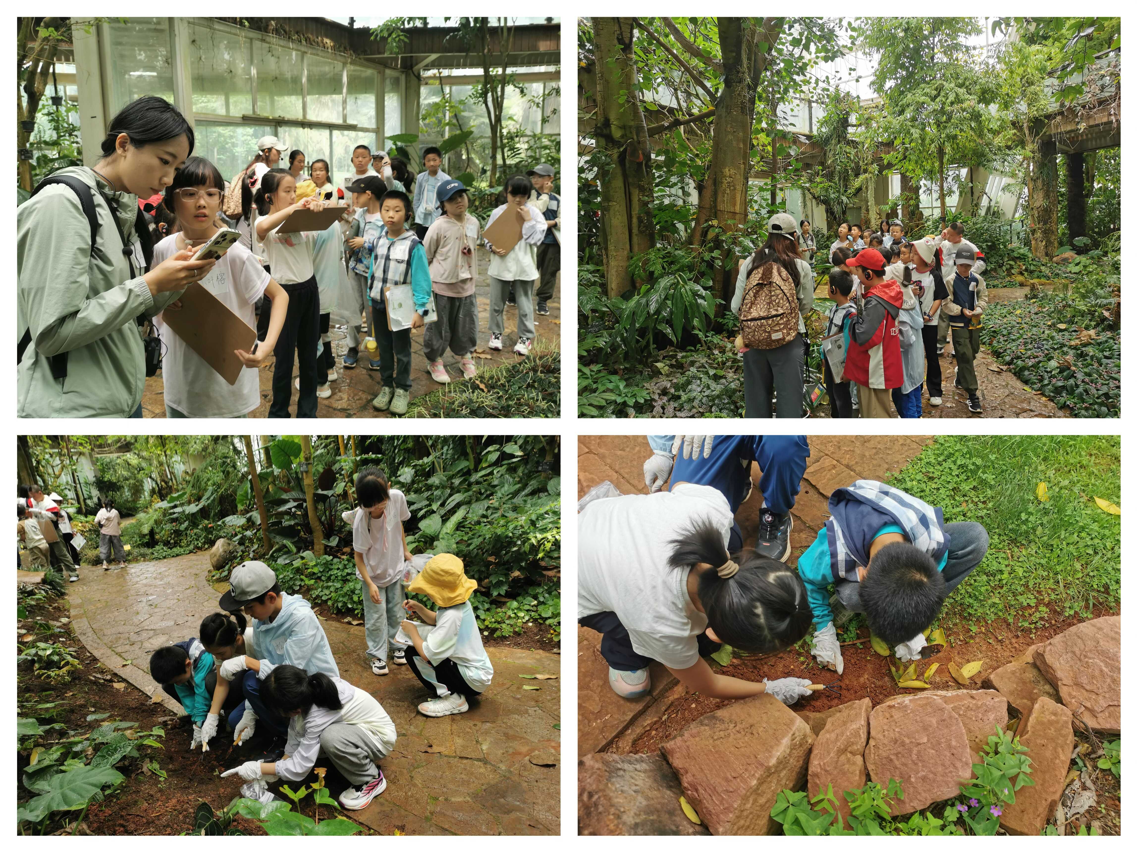 活动伊始,“小侦探”们便俯身大地,从认识一捧看似平凡的土壤开始破案。进入享有盛誉的COP15生物多样性体验园——扶荔宫、羽西杜鹃园、百草园、金缕梅园等专类园,孩子们化身“土壤分析师”,穿梭于热带雨林、热带荒漠、亚热带、温带等不同气候带区域,触摸土壤,细致观察,对比疏松透气的沙质土、肥沃湿润的腐殖土和粘性沉重的红壤。不仅清晰辨识了土壤结构、颜色与质地的巨大差异,更在导师引导下,发现了植物为适应不同土壤环境而展现的生存智慧——沙漠植物的深根系与多浆叶片、雨林附生植物独特的“气生根”。这些无一不是环境塑造生命的生动教材。