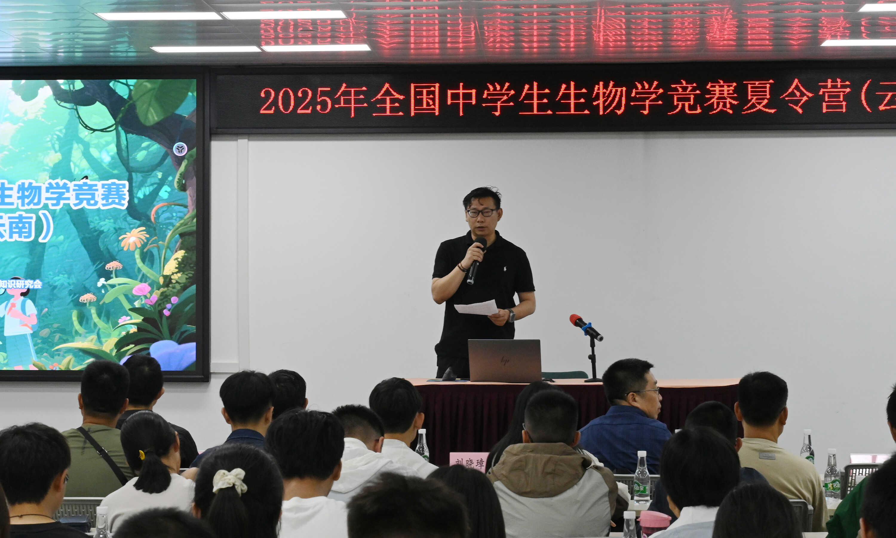 刘晓璋致辞 本次活动邀请到云南大学王后平副教授、云南师范大学附属中学正高级教师王欧老师、北京市特级教师张斌老师、首都师范大学姚云志教授等多位著名专家以及全国生物学竞赛金牌讲师联袂授课。讲授内容涉及了植物学、动物学、生物化学等核心领域。课程采用了“理论精讲+竞赛策略+研学体验+实验特训”的立体化授课体系,精准面向全省各地州高中一年级优秀学生及一线教练员,旨在搭建高规格学术交流平台,发掘并培养生物学后备人才,为云南学子参与全国生物学竞赛并获得良好成绩提供支持。 在讲座环节中,王后平副教授结合自己的科学研究实践,以现代分子生物学的前沿进展为主题,给同学们展现了分子生物学的魅力。王欧老师基于其丰富的指导学生参与全国生物学竞赛的经验,总结了全国和云南省中学生生物学竞赛的现状,客观分析了近年来云南省学子参与竞赛的基本表现,并对未来的发展趋势和路径提出展望。张斌老师、姚云志教授是国内著名的生物学竞赛金牌讲师,他们分别对全国中学生生物学竞赛中涉及的生物化学、动物学等内容进行了专题讲解。专家们强调,云南省中学生生物学竞赛发展必然是一个由弱到强的过程,虽然强调要提高中学生的竞赛成绩,但这并非唯一目的,推动中学生参与生物竞赛的根本目的在于为“学有余力”且对生物学学科充满兴趣的中学生提供一个较好的平台,从而解决同学们“为什么要读书”“读书有什么用”“好成绩从何而来”等疑惑,使学生们真正产生自我学习的内驱力。
